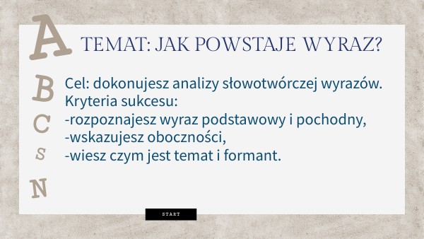 Cel: dokonujesz analizy słowotwórczej wyrazów. Kryteria sukcesu: -rozpoznajesz wyraz podstawowy i pochodny, -wskazujesz oboczności, -wiesz czym jest temat i formant.