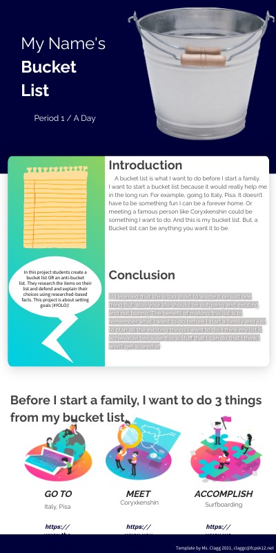 In this project students create a bucket list OR an anti-bucket list. They research the items on their list and defend and explain their choices using researched-based facts. This project is about setting goals (#YOLO)!