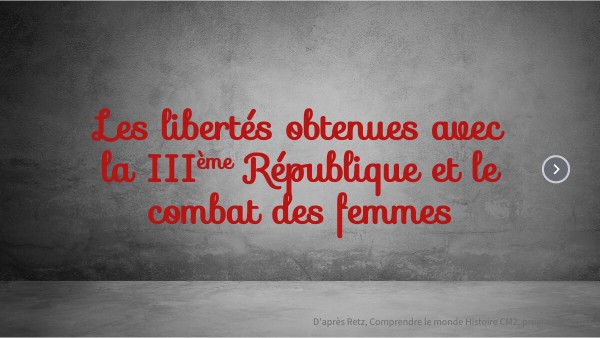 A retenir :La IIIème République, en plus des lois sur l'école, fait voter des lois pour la liberté des français : - liberté de la presse (création de nombreux journaux), - liberté de réunion, d'opinion, d'expression (chacun peut exprimer ses idées), - liberté syndicale... Mais les femmes ne sont pas des citoyennes à l'égal des hommes : elles ne peuvent ni voter ni se faire élire. Pendant tout le XIXème siècle, de plus en plus de gens vont se battre pour le droit de vote des femmes en France.