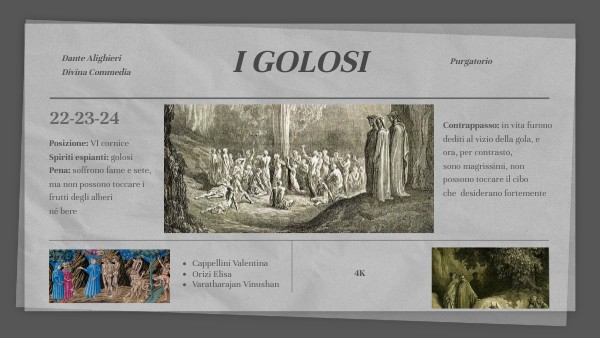 Posizione: VI cornice Spiriti espianti: golosi Pena: soffrono fame e sete, ma non possono toccare i frutti degli alberi né bere