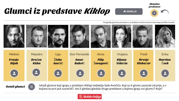Istraži glumce koji igraju u predstavi Kiklop redatelja Saše Anočića. Koji su ti glumci poznati od prije, a s kojima se prvi put susrećeš? Jesi li gledao/gledala druge predstave u kojima igraju ovi glumci? Koje?