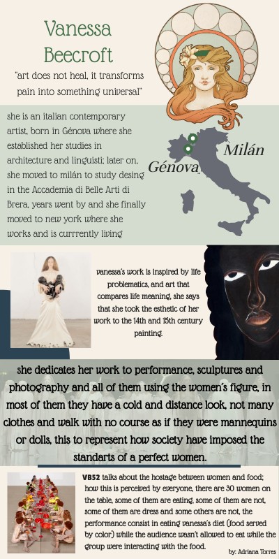 she dedicates her work to performance, sculptures and photography and all of them using the women´s figure, in most of them they have a cold and distance look, not many clothes and walk with no course as if they were mannequins or dolls, this to represent how society have imposed the standarts of a perfect women.