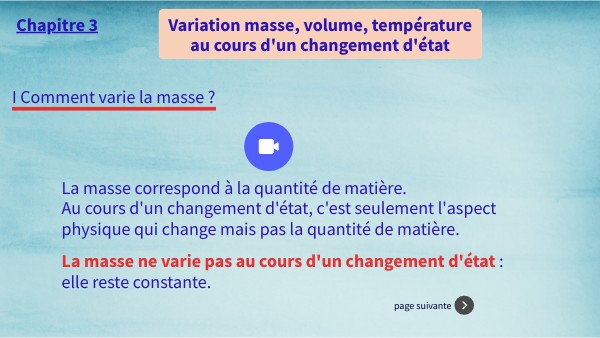La masse correspond à la quantité de matière. Au cours d'un changement d'état, c'est seulement l'aspect physique qui change mais pas la quantité de matière.
