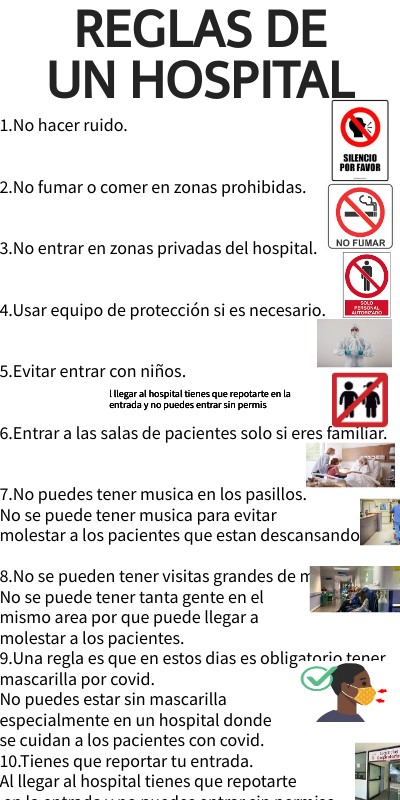 1.No hacer ruido. 2.No fumar o comer en zonas prohibidas. 3.No entrar en zonas privadas del hospital. 4.Usar equipo de protección si es necesario. 5.Evitar entrar con niños. 6.Entrar a las salas de pacientes solo si eres familiar. 7.No puedes tener musica en los pasillos. No se puede tener musica para evitar molestar a los pacientes que estan descansando 8.No se pueden tener visitas grandes de mucha gente. No se puede tener tanta gente en el mismo area por que puede llegar a molestar a los pacientes. 9.Una regla es que en estos dias es obligatorio tener mascarilla por covid. No puedes estar sin mascarilla especialmente en un hospital donde se cuidan a los pacientes con covid. 10.Tienes que reportar tu entrada. Al llegar al hospital tienes que repotarte en la entrada y no puedes entrar sin permiso.