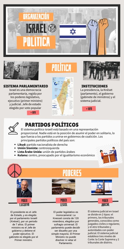 Israel es una democracia parlamentaria, regida por los poderes legislativo, ejecutivo (primer ministro) y judicial. Jefe de estado elegido por voto popular