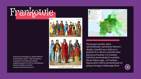 Ilustracja pochodząca z dzieła Alberta Kretschmera (1825– 1891) Kostiumy wszystkich narodów od czasów najdawniejszych do XIX w. przedstawia stroje Franków w okresie wczesnośredniowiecznym.