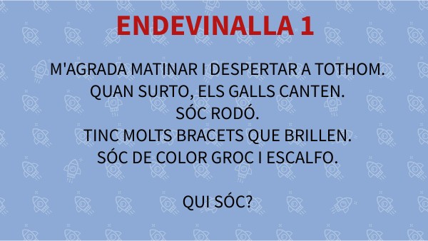 M'AGRADA MATINAR I DESPERTAR A TOTHOM. QUAN SURTO, ELS GALLS CANTEN. SÓC RODÓ. TINC MOLTS BRACETS QUE BRILLEN. SÓC DE COLOR GROC I ESCALFO. QUI SÓC?