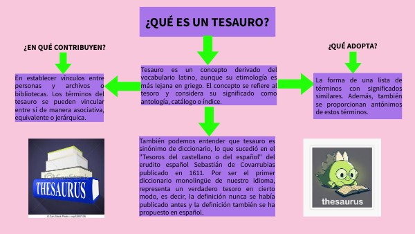 Tesauro es un concepto derivado del vocabulario latino, aunque su etimología es más lejana en griego. El concepto se refiere al tesoro y considera su significado como antología, catálogo o índice.