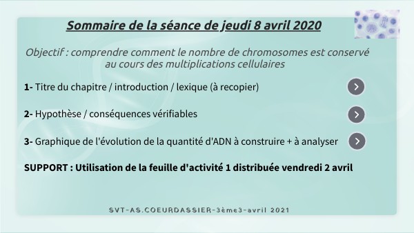 Objectif : comprendre comment le nombre de chromosomes est conservé au cours des multiplications cellulaires