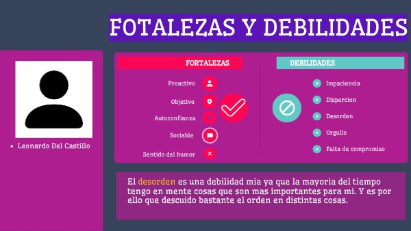 El desorden es una debilidad mia ya que la mayoria del tiempo tengo en mente cosas que son mas importantes para mi. Y es por ello que descuido bastante el orden en distintas cosas.