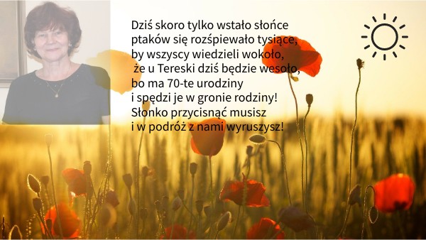 Dziś skoro tylko wstało słońce ptaków się rozśpiewało tysiące, by wszyscy wiedzieli wokoło, że u Tereski dziś będzie wesoło, bo ma 70-te urodziny i spędzi je w gronie rodziny! Słonko przycisnąć musisz i w podróż z nami wyruszysz!