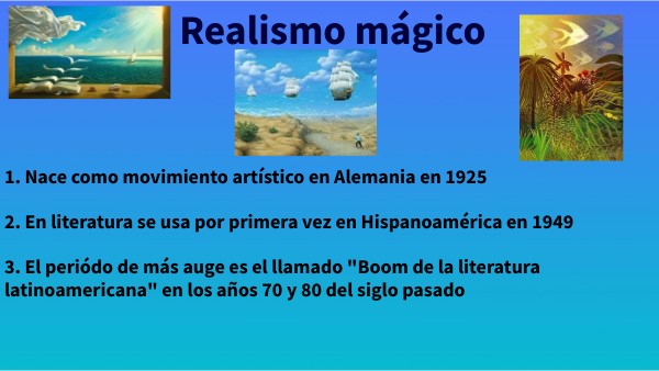 1. Nace como movimiento artístico en Alemania en 1925 2. En literatura se usa por primera vez en Hispanoamérica en 1949 3. El periódo de más auge es el llamado "Boom de la literatura latinoamericana" en los años 70 y 80 del siglo pasado