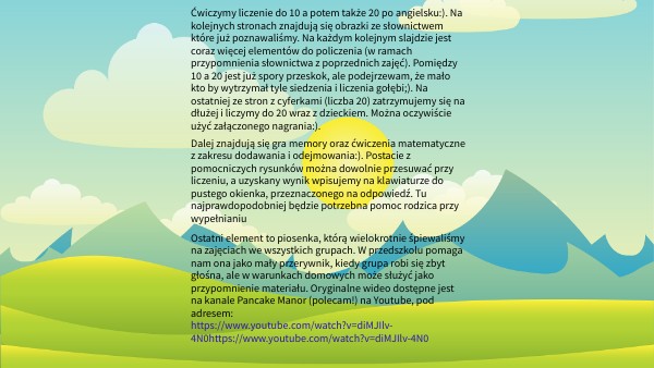 Ćwiczymy liczenie do 10 a potem także 20 po angielsku:). Na kolejnych stronach znajdują się obrazki ze słownictwem które już poznawaliśmy. Na każdym kolejnym slajdzie jest coraz więcej elementów do policzenia (w ramach przypomnienia słownictwa z poprzednich zajęć). Pomiędzy 10 a 20 jest już spory przeskok, ale podejrzewam, że mało kto by wytrzymał tyle siedzenia i liczenia gołębi;). Na ostatniej ze stron z cyferkami (liczba 20) zatrzymujemy się na dłużej i liczymy do 20 wraz z dzieckiem. Można oczywiście użyć załączonego nagrania:).