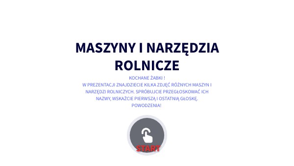 KOCHANE ŻABKI !W PREZENTACJI ZNAJDZIECIE KILKA ZDJĘĆ RÓŻNYCH MASZYN I NARZĘDZI ROLNICZYCH. SPRÓBUJCIE PRZEGŁOSKOWAĆ ICH NAZWY, WSKAŻCIE PIERWSZĄ I OSTATNIĄ GŁOSKĘ. POWODZENIA!