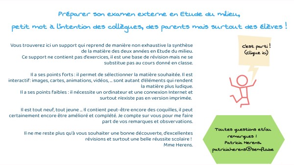 Vous trouverez ici un support qui reprend de manière non exhaustive la synthèse de la matière des deux années en Etude du milieu. Ce support ne contient pas d'exercices, il est une base de révision mais ne se substitue pas au cours donné en classe. Il a ses points forts : il permet de sélectionner la matière souhaitée. Il est interactif: images, cartes, animations, vidéos, ... sont autant d'éléments qui rendent la matière plus ludique. Il a ses points faibles : il nécessite un ordinateur et une connexion Internet et surtout n'existe pas en version imprimée. Il est tout neuf, tout jeune ... Il contient peut-être encore des coquilles, il peut certainement encore être amélioré et complété. Je compte sur vous pour me faire part de vos remarques et obsvervations. Il ne me reste plus qu'à vous souhaiter une bonne découverte, d'excellentes révisions et surtout une belle réussite scolaire ! Mme Herens.