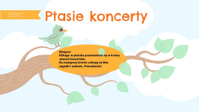 Witajcie! Klikając w ptaszka przeniesiecie się w krainę ptasich koncertów. Na następnej stronie czekają na Was zagadki i zadania. Powodzenia!