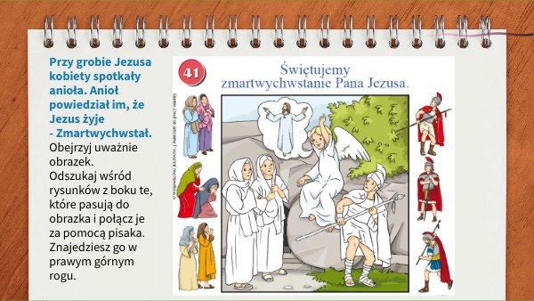 Przy grobie Jezusa kobiety spotkały anioła. Anioł powiedział im, że Jezus żyje - Zmartwychwstał. Obejrzyj uważnie obrazek. Odszukaj wśród rysunków z boku te, które pasują do obrazka i połącz je za pomocą pisaka. Znajedziesz go w prawym górnym rogu.