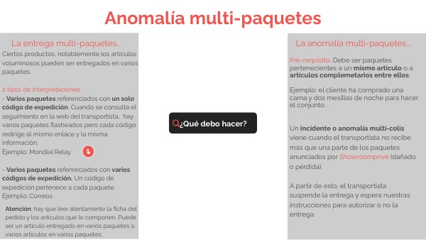 Un incidente o anomalía multi-colis viene cuando el transportista no recibe más que una parte de los paquetes anunciados por Showroomprivé (dañado o pérdida). A partir de esto, el transportista suspende la entrega y espera nuestras instrucciones para autorizar o no la entrega.