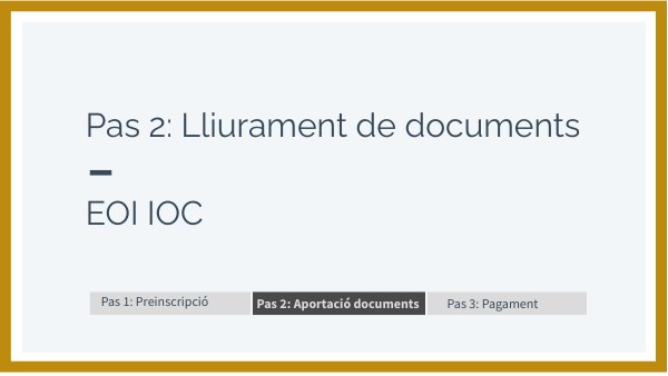 Aneu a la pestanya Documents Aportats. Adjunteu escanejat o fotografiat el vostre DNI (les dues cares preferiblement en un sol document), NIE (les dues cares) o passaport. Des d'aquesta mateixa pestanya, podreu adjuntar la documentació acreditativa per tenir dret a la bonificació o l'exempció del preu de matrícula.