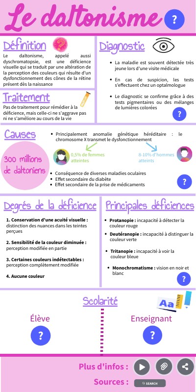 Le daltonisme, appelé aussi dyschromatopsie, est une déficience visuelle qui se traduit par une altération de la perception des couleurs qui résulte d'un dysfonctionnement des cônes de la rétine présent dès la naissance