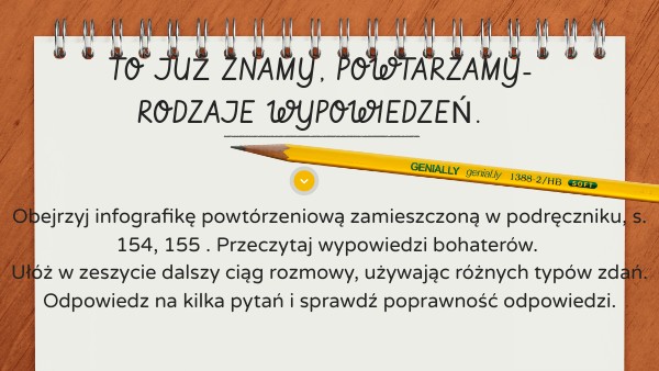 Obejrzyj infografikę powtórzeniową zamieszczoną w podręczniku, s. 154, 155 . Przeczytaj wypowiedzi bohaterów. Ułóż w zeszycie dalszy ciąg rozmowy, używając różnych typów zdań.Odpowiedz na kilka pytań i sprawdź poprawność odpowiedzi.