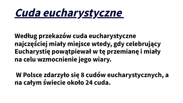 Według przekazów cuda eucharystyczne najczęściej miały miejsce wtedy, gdy celebrujący Eucharystię powątpiewał w tę przemianę i miały na celu wzmocnienie jego wiary. W Polsce zdarzyło się 8 cudów eucharystycznych, a na całym świecie około 24 cuda.
