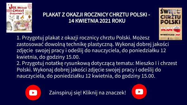 1. Przygotuj plakat z okazji rocznicy chrztu Polski. Możesz zastosować dowolną technikę plastyczną. Wykonaj dobrej jakości zdjęcie swojej pracy i odeślij do nauczyciela, do poniedziałku 12 kwietnia, do godziny 15.00. 2. Przygotuj notatkę rysunkową dotyczącą tematu: Mieszko I i chrzest Polski. Wykonaj dobrej jakości zdjęcie swojej pracy i odeślij do nauczyciela, do poniedziałku 12 kwietnia, do godziny 15.00.