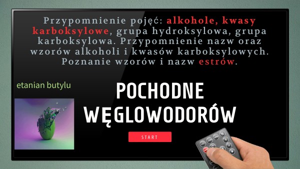 Przypomnienie pojęć: alkohole, kwasy karboksylowe, grupa hydroksylowa, grupa karboksylowa. Przypomnienie nazw oraz wzorów alkoholi i kwasów karboksylowych. Poznanie wzorów i nazw estrów.