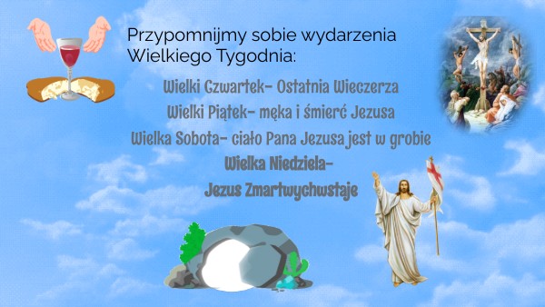 Wielki Czwartek- Ostatnia WieczerzaWielki Piątek- męka i śmierć Jezusa Wielka Sobota- ciało Pana Jezusa jest w grobie Wielka Niedziela- Jezus Zmartwychwstaje