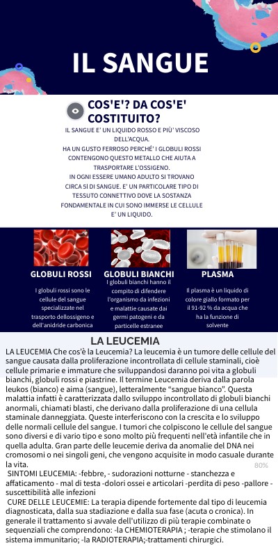 LA LEUCEMIA Che cos’è la Leucemia? La leucemia è un tumore delle cellule del sangue causata dalla proliferazione incontrollata di cellule staminali, cioè cellule primarie e immature che sviluppandosi daranno poi vita a globuli bianchi, globuli rossi e piastrine. Il termine Leucemia deriva dalla parola leukos (bianco) e aima (sangue), letteralmente “sangue bianco”. Questa malattia infatti è caratterizzata dallo sviluppo incontrollato di globuli bianchi anormali, chiamati blasti, che derivano dalla proliferazione di una cellula staminale danneggiata. Queste interferiscono con la crescita e lo sviluppo delle normali cellule del sangue. I tumori che colpiscono le cellule del sangue sono diversi e di vario tipo e sono molto più frequenti nell'età infantile che in quella adulta. Gran parte delle leucemie deriva da anomalie del DNA nei cromosomi o nei singoli geni, che vengono acquisite in modo casuale durante la vita. SINTOMI LEUCEMIA: -febbre, - sudorazioni notturne - stanchezza e affaticamento - mal di testa -dolori ossei e articolari -perdita di peso -pallore -suscettibilità alle infezioni CURE DELLE LEUCEMIE: La terapia dipende fortemente dal tipo di leucemia diagnosticata, dalla sua stadiazione e dalla sua fase (acuta o cronica). In generale il trattamento si avvale dell'utilizzo di più terapie combinate o sequenziali che comprendono: -la CHEMIOTERAPIA ; -terapie che stimolano il sistema immunitario; -la RADIOTERAPIA;-trattamenti chirurgici.