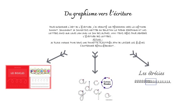 Pour enseigner l'art de l'écriture ,j'ai orienté ma pégagogie vers la méthode Dumont .Seulement je souhaitais mettre en relation la forme graphique et les lettres ainsi que leur lien avec le son des alphas .Voici trois idées pour aborder l'écriture des lettres .Astuce : Je place chaque fiche dans une pochette plastifiée afin de laisser les élèves s'entrainer régulièrement .