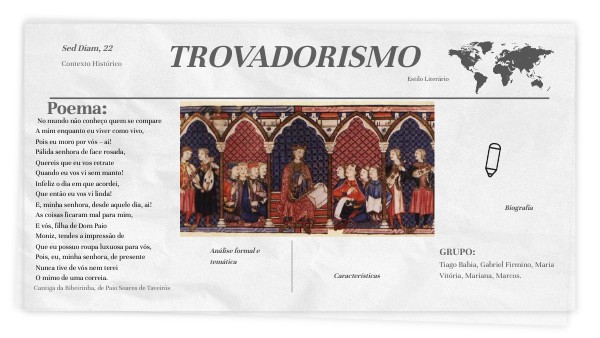 -Toda a produção textual que era desenvolvida tinha sempre o acompanhamento feito por alguns instrumentos musicais, por essa razão é que tinham o nome de cantigas.Foi um dos gêneros literários mais populares da Idade Média, ao lado das novelas de cavalaria, expressão da prosa no período. -O trovadorismo era dividido em dois gêneros distintos: o lírico e o satírico. No trovadorismo lírico existiam as cantigas de amor e de amigo, que falavam das sensações e os sentimentos que existia nas relações. As produções do trovadorismo geralmente eram voltadas para temas que envolvessem amor e sofrimento amoroso. -O trovadorismo foi o primeiro movimento artístico que se deu na poesia europeia.