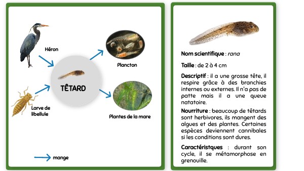 Nourriture : beaucoup de têtards sont herbivores, ils mangent des algues et des plantes. Certaines espèces deviennent cannibales si les conditions sont dures.