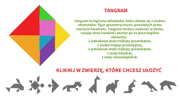 Tangram to logiczna układanka, która składa się z siedmu elementów- figur geometrycznych, powstałych przez rozcięcie kwadratu. Tangram możesz wykonać w domu, rysując duży kwadrat i dzieląc go na poszczególne elementy: 2 jednakowe duże trójkąty prostokątne, 1 średni trójkąt prostokątny, 2 jednakowe małe trójkąty prostokątne, 1 mały kwadrat, 1 mały równoległobok.