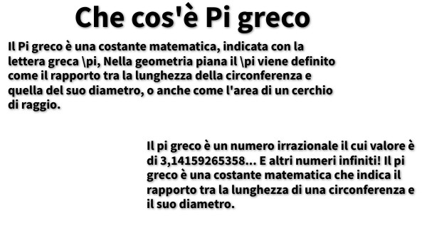 Il Pi greco è una costante matematica, indicata con la lettera greca \pi, Nella geometria piana il \pi viene definito come il rapporto tra la lunghezza della circonferenza e quella del suo diametro, o anche come l'area di un cerchio di raggio.