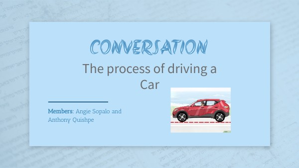 Angie: Hi AnthonyAnthony: Hi Angie, how are you? Angie: Very good, and you? Anthony: Good, I'm happy. Angie: Why are you happy? Anthony: Because I bought a luxury car. Angie: Really! Anthony: Yes, I already want to drive it. Angie: I understand, but you must drive carefully. Anthony: Could you tell me what the process is for driving a car? Angie: With pleasure, the first thing you should know is the controls of the car. Anthony: That is very important. Angie: You must learn the basic rules of driving. Anthony: How interesting. What are the driving rules? Angie: The most important driving rules are wearing a seat belt, using the brake pedal to stop your car, adjusting the rearview mirror allows you to see what is behind the left or right side of the car, paying attention, among others. Anthony: I already understand more about the process.