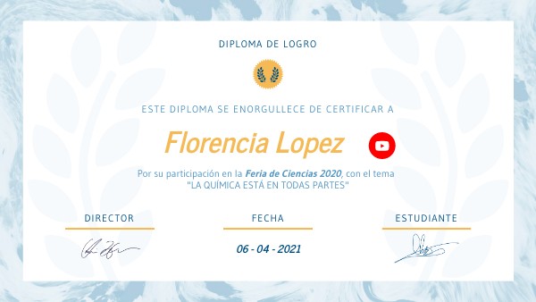 Por su participación en la Feria de Ciencias 2020, con el tema "LA QUÍMICA ESTÁ EN TODAS PARTES"