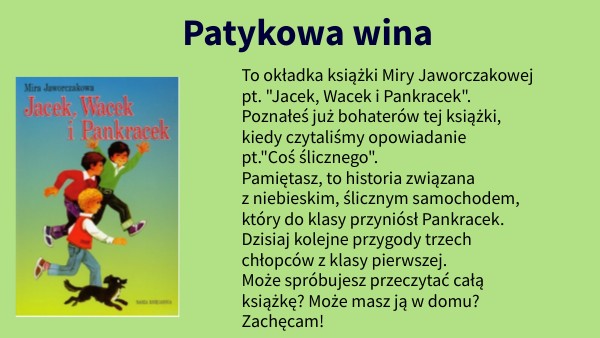 To okładka książki Miry Jaworczakowej pt. "Jacek, Wacek i Pankracek". Poznałeś już bohaterów tej książki, kiedy czytaliśmy opowiadanie pt."Coś ślicznego". Pamiętasz, to historia związana z niebieskim, ślicznym samochodem, który do klasy przyniósł Pankracek. Dzisiaj kolejne przygody trzech chłopców z klasy pierwszej. Może spróbujesz przeczytać całą książkę? Może masz ją w domu? Zachęcam!