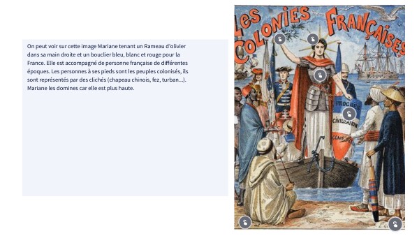 On peut voir sur cette image Mariane tenant un Rameau d'olivier dans sa main droite et un bouclier bleu, blanc et rouge pour la France. Elle est accompagné de personne française de différentes époques. Les personnes à ses pieds sont les peuples colonisés, ils sont représentés par des clichés (chapeau chinois, fez, turban...). Mariane les domines car elle est plus haute.