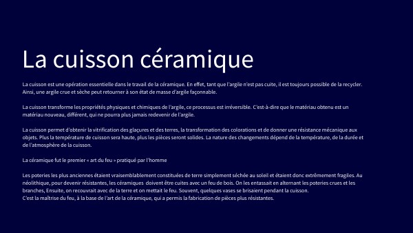A retenir: 2ème cuisson qui ne cuit que l'émail pour la faience et la terre et l'émail pour le grès et la porcelaine Les pièces ne peuvent pas se toucher Grand feu=faience=980°c environ Haute température=grès ou porcelaine= 1280°c environ