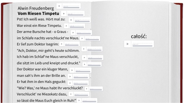 Pst! Ich weiß was. Hört mal zu: War einst ein Riese Timpetu. Der arme Bursche hat - o Graus - im Schlafe nachts verschluckt'ne Maus. Er lief zum Doktor Isegrim: "Ach, Doktor, mir geht's heute schlimm. Ich hab im Schlaf'ne Maus verschluckt, die sitzt im Leib und kneipt und druckt." Der Doktor war ein kluger Mann, man sah's ihm an der Brille an. Er hat ihm in den Hals geguckt:"Wie? Was,' ne Maus habt Ihr verschluckt? Verschluckt' ne Miezekatz dazu, so lässt die Maus Euch gleich in Ruh!"