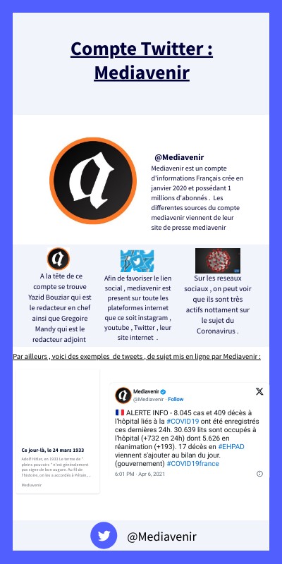 Mediavenir est un compte d'informations Français crée en janvier 2020 et possédant 1 millions d'abonnés . Les differentes sources du compte mediavenir viennent de leur site de presse mediavenir