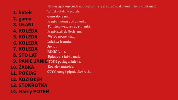 Na naszych zajęciach nauczyliśmy się już grać na dzwonkach (cymbałkach). Wlazł kotek na płotek. Game do re mi… Przybyli ułani pod okienko. Pójdźmy wszyscy do stajenki. Przybieżeli do Betlejem. Wśród nocnej ciszy. Lulaj, że Jezuniu. Sto lat. PANIE Janie. Była sobie żabka mała. JEDZIE pociąg z daleka. Koziołek matołek. GDY strumyk płynie-stokrotka