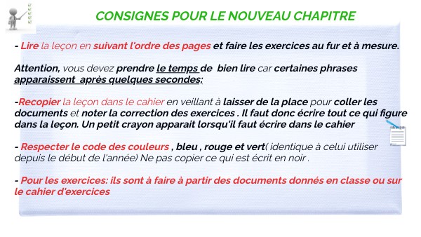 - Lire la leçon en suivant l'ordre des pages et faire les exercices au fur et à mesure. Attention, vous devez prendre le temps de bien lire car certaines phrases apparaissent après quelques secondes; -Recopier la leçon dans le cahier en veillant à laisser de la place pour coller les documents et noter la correction des exercices . Il faut donc écrire tout ce qui figure dans la leçon. Un petit crayon apparait lorsqu'il faut écrire dans le cahier - Respecter le code des couleurs , bleu , rouge et vert( identique à celui utiliser depuis le début de l'année) Ne pas copier ce qui est écrit en noir . - Pour les exercices: ils sont à faire à partir des documents donnés en classe ou sur le cahier d'exercices