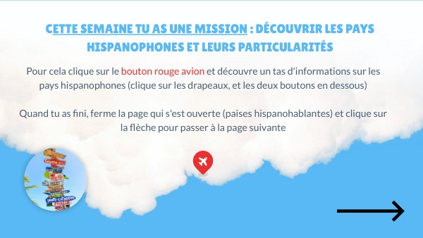 Pour cela clique sur le bouton rouge avion et découvre un tas d'informations sur les pays hispanophones (clique sur les drapeaux, et les deux boutons en dessous) Quand tu as fini, ferme la page qui s'est ouverte (paises hispanohablantes) et clique sur la flèche pour passer à la page suivante