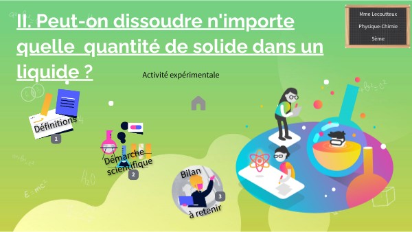 Lorsqu'on dissout un solide, appelé soluté, dans un liquide, appelé solvant, on effectue une dissolution. On obtient un mélange homogène appelé solution.