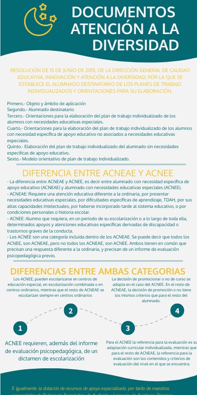 - La diferencia entre ACNEAE y ACNEE, es decir entre alumnado con necesidad específica de apoyo educativo (ACNEAE) y alumnado con necesidades educativas especiales (ACNEE).- ACNEAE: Requiere una atención educativa diferente a la ordinaria, por presentar necesidades educativas especiales, por dificultades específicas de aprendizaje, TDAH, por sus altas capacidades intelectuales, por haberse incorporado tarde al sistema educativo, o por condiciones personales o historia escolar. - ACNEE: Alumno que requiera, en un periodo de su escolarización o a lo largo de toda ella, determinados apoyos y atenciones educativas específicas derivadas de discapacidad o trastornos graves de la conducta. - Los ACNEE son una categoría incluida dentro de los ACNEAE. Se puede decir que todos los ACNEE, son ACNEAE, pero no todos los ACNEAE, son ACNEE. Ambos tienen en común que precisan una respuesta diferente a la ordinaria, y precisan de un informe de evaluación psicopedagógica previo.