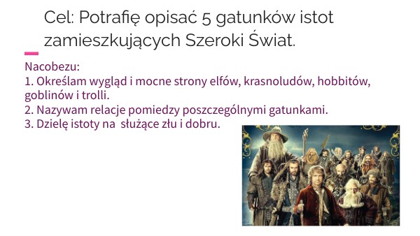 Cel: Potrafię opisać 5 gatunków istot zamieszkujących Szeroki Świat.
