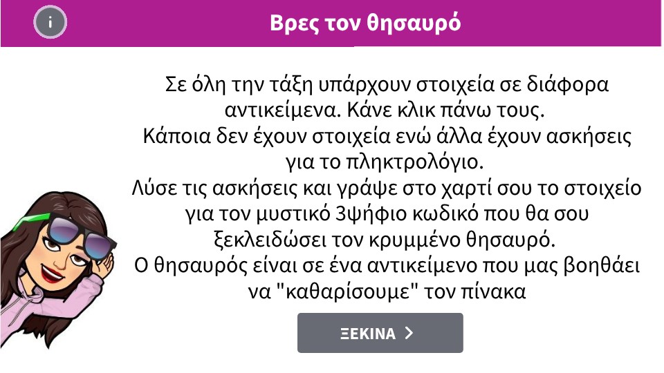 Σε όλη την τάξη υπάρχουν στοιχεία σε διάφορα αντικείμενα. Κάνε κλικ πάνω τους. Κάποια δεν έχουν στοιχεία ενώ άλλα έχουν ασκήσεις για το πληκτρολόγιο. Λύσε τις ασκήσεις και γράψε στο χαρτί σου το στοιχείο για τον μυστικό 3ψήφιο κωδικό που θα σου ξεκλειδώσει τον κρυμμένο θησαυρό. Ο θησαυρός είναι σε ένα αντικείμενο που μας βοηθάει να "καθαρίσουμε" τον πίνακα