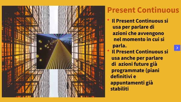 * Il Present Continuous si usa per parlare di azioni che avvengono nel momento in cui si parla. * Il Present Continuous si usa anche per parlare di azioni future già programmate (piani definitivi e appuntamenti già stabiliti